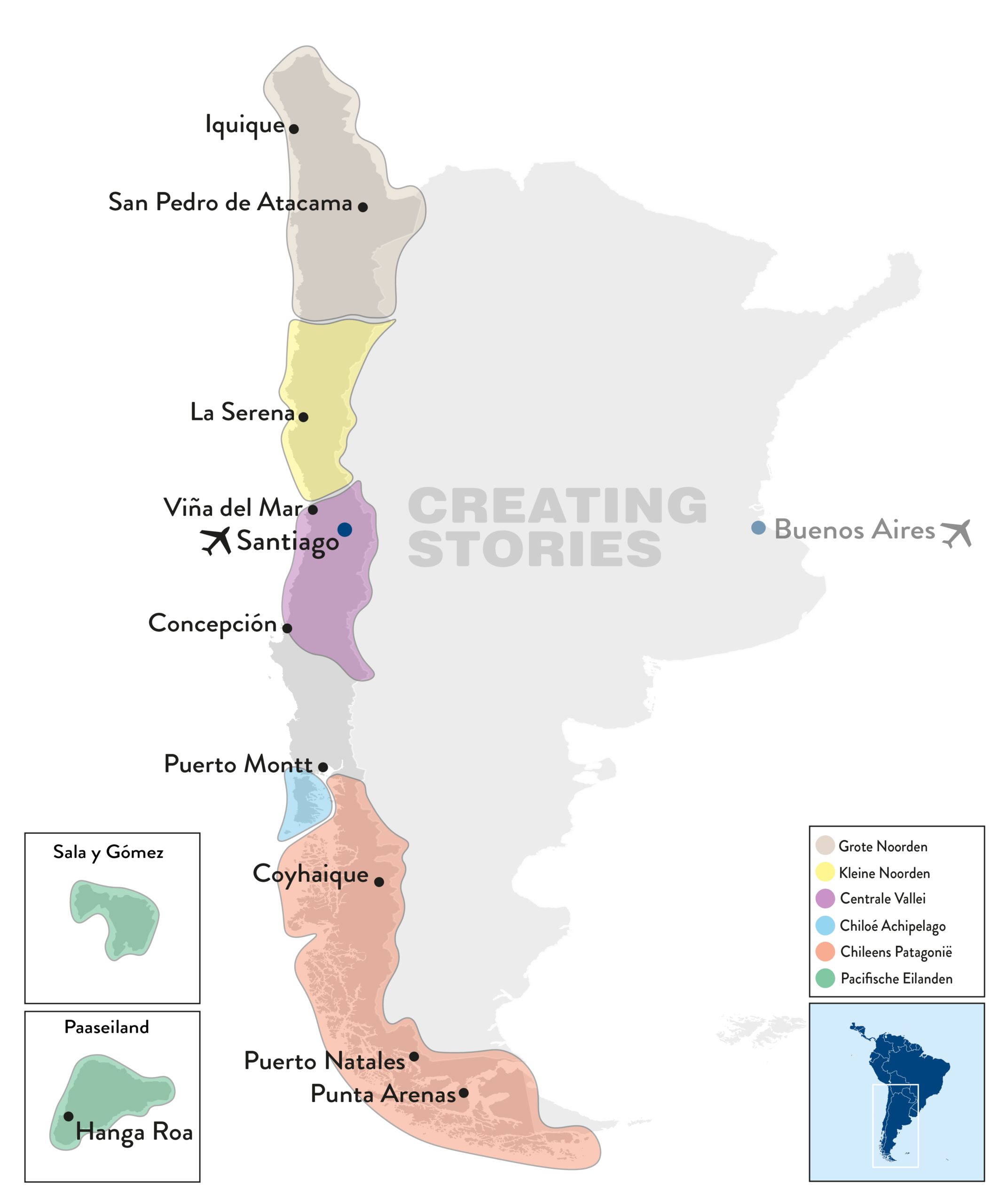 Chili is een langgerekt land dat zich uitstrekt van de dorre woestijnen in het noorden tot de ijzige fjorden in het uiterste zuiden. Hoewel het land administratief verdeeld is in 54 provincies en 15 regio’s, gebruiken wij een geografische indeling die de reiservaring beter weergeeft. We onderscheiden vijf hoofdzones: Noord-Chili, Centraal-Chili, Zuid-Chili, Patagonië en Paaseiland.