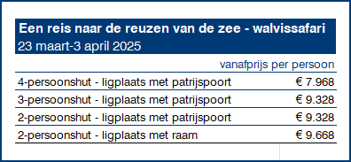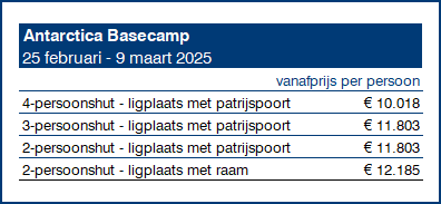 Voor het komende voorjaar hebben wij vier cruises naar Antarctica in de aanbieding. Voor de Zuidpoolregio is dit de nazomer, op het zuidelijk halfrond ligt dat natuurlijk net andersom. Deze vier vertrekken in 2025 bieden wij aan met 15% korting op de cruise. De vanafprijs is afhankelijk van de kosten van de vluchten en de beschikbaarheid / keuze van de accommodatie in Buenos Aires en Ushuaia. De prijs voor de cruise (inclusief de korting) is een vaste prijs, afhankelijk van de keuze van je hut aan boord. De korting is geldig in combinatie met de volgende pakketten.
