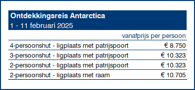 Voor het komende voorjaar hebben wij vier cruises naar Antarctica in de aanbieding. Voor de Zuidpoolregio is dit de nazomer, op het zuidelijk halfrond ligt dat natuurlijk net andersom. Deze vier vertrekken in 2025 bieden wij aan met 15% korting op de cruise. De vanafprijs is afhankelijk van de kosten van de vluchten en de beschikbaarheid / keuze van de accommodatie in Buenos Aires en Ushuaia. De prijs voor de cruise (inclusief de korting) is een vaste prijs, afhankelijk van de keuze van je hut aan boord. De korting is geldig in combinatie met de volgende pakketten.