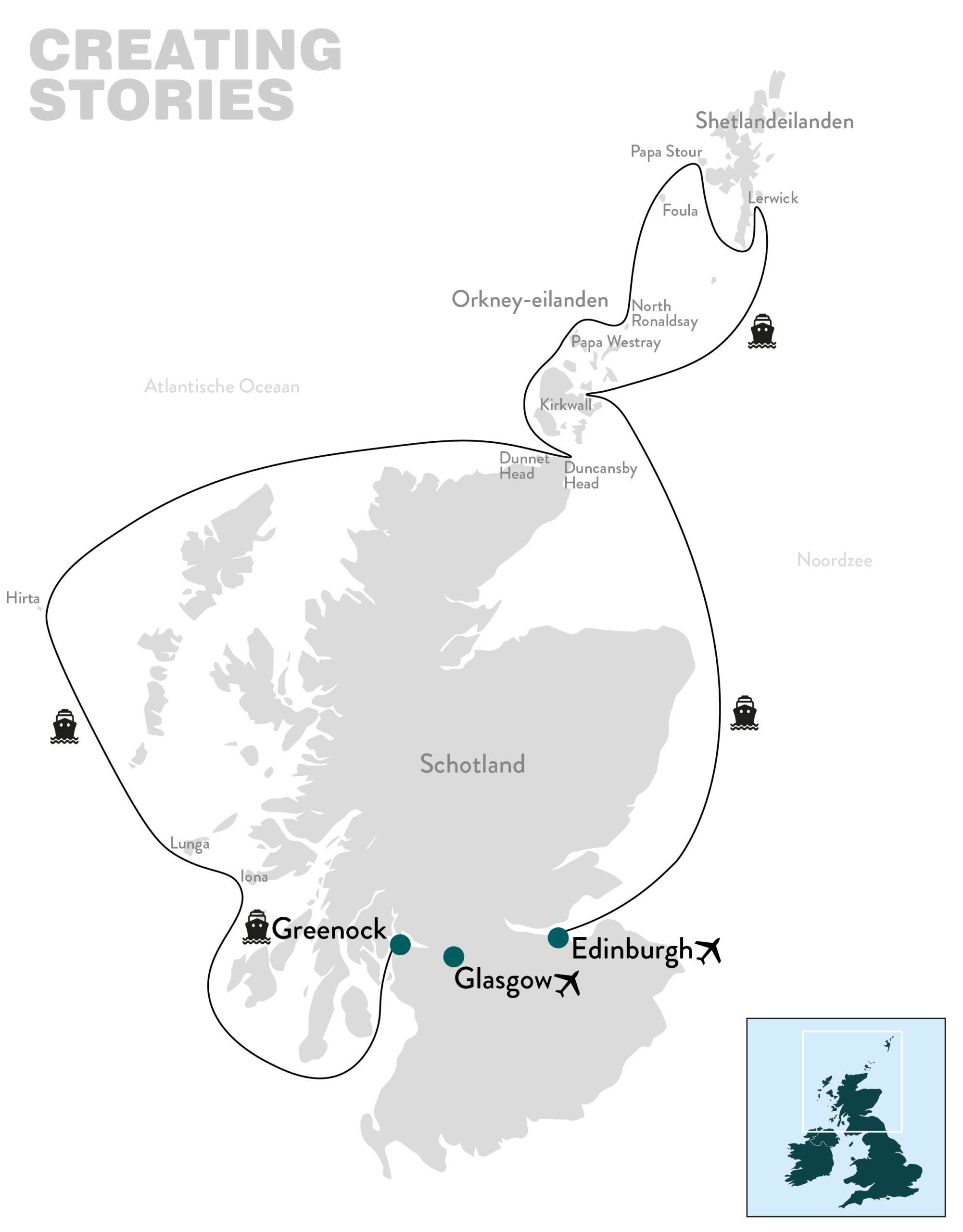 Je reis begint in Glasgow, een stad vol geschiedenis en karakter. In de namiddag word je verwelkomd door het expeditieteam en naar de haven van Greenock gebracht. Daar ga je aan boord van het expeditiecruiseschip dat je de komende dagen langs de Schotse eilanden zal voeren.
