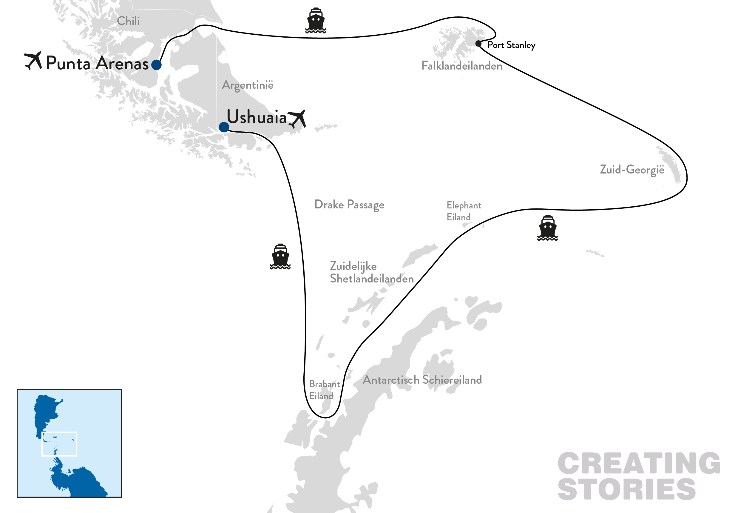 Later in de middag vertrek je gezamenlijk naar de haven. Daar wacht het expeditiecruiseschip dat je de komende weken door de ruige Zuidelijke Oceaan zal varen. Terwijl het schip langzaam de Straat van Magellaan opvaart, deelt het expeditieteam de eerste verhalen over de zeemansgeschiedenis van deze legendarische route.