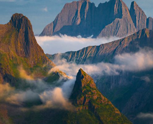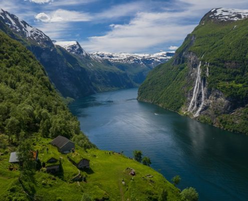 Vanaf de boot komen we direct in een Noors sprookje terecht. We tellen honderden kleine watervalletjes en zien in de verte de neuzen van reusachtige rotsen hoog boven het landschap uitsteken.