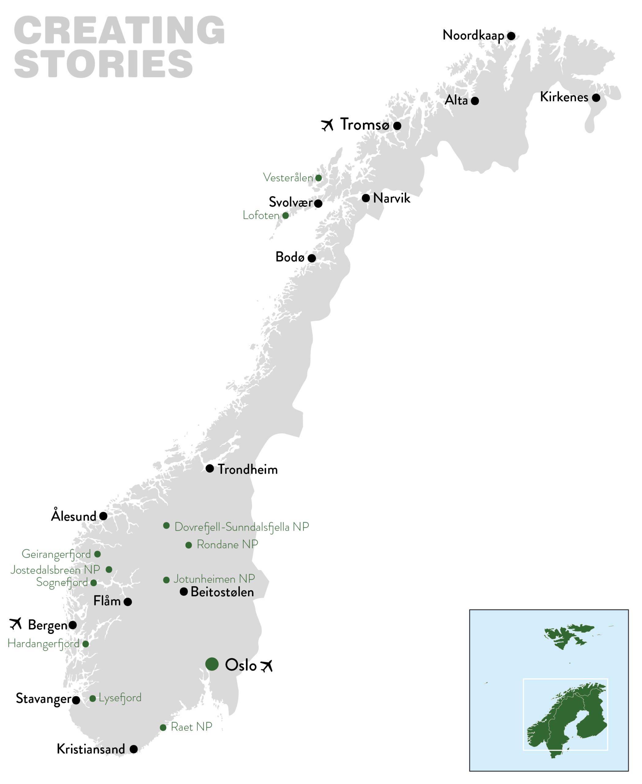 Het land is onderverdeeld in vijf hoofdregio’s: Noord-Noorwegen, Centraal-Noorwegen, West-Noorwegen, Oost-Noorwegen en Zuid-Noorwegen. Elke regio bestaat uit meerdere provincies en heeft zijn eigen karakter, natuur en mogelijkheden voor avontuurlijke of culturele activiteiten.