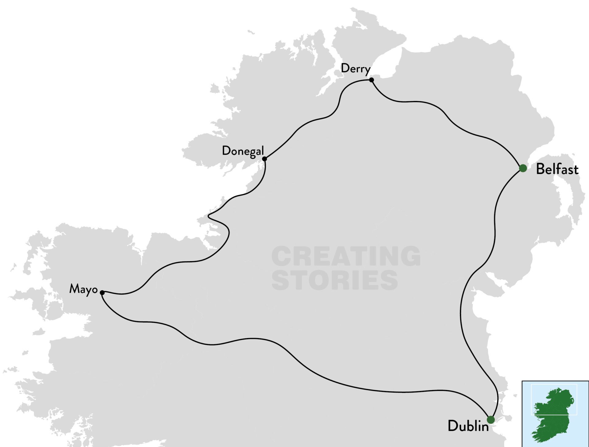 In Belfast kan je een kijkje nemen bij de Albert Memorial Clock of een van de andere hoogtepunten van de stad. De volgende ochtend verlaat je Belfast voor een rit langs de Antrim Coast en reis je verder in de richting van Derry. De volgende dag kan je een bezoek brengen aan het Glenveagh National Park, daar vandaan reis je verder naar Donegal.
