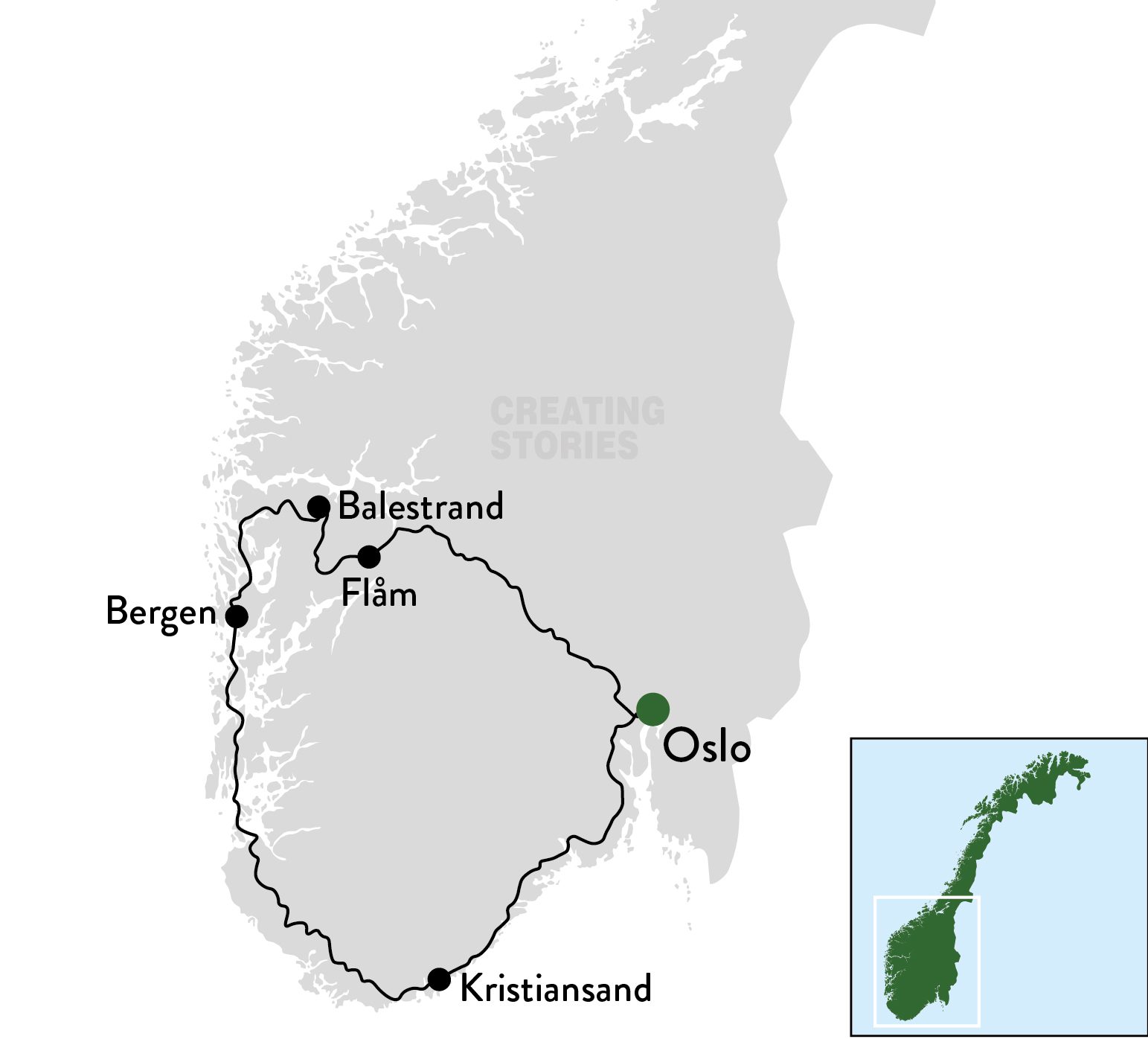 De reis begint in de hoofdstad van het land, Oslo, waarna je de volgende dag op de Bergen Railway richting Myrdal stapt. In Myrdal stap je over op de bekendste spoorlijn de Flåmsbana. Je reist door een schitterende omgeving met als eindbestemming Balestrand, gelegen aan de indrukwekkende Sognefjord. Vanuit Balestrand gaat de reis verder naar het westen richting de op een na grootste stad van Noorwegen, Bergen. In Bergen kan je een bezoek brengen aan de historische wijk Brygge of ga omhoog naar de berg Fløyen, waar vandaan je een prachtig uitzicht hebt over de stad. In Bergen stap je aan boord van de Fjordline die je via Stavanger naar Langesund brengt. Vanuit daar neem je de trein weer terug naar het begin punt van de reis, Oslo.