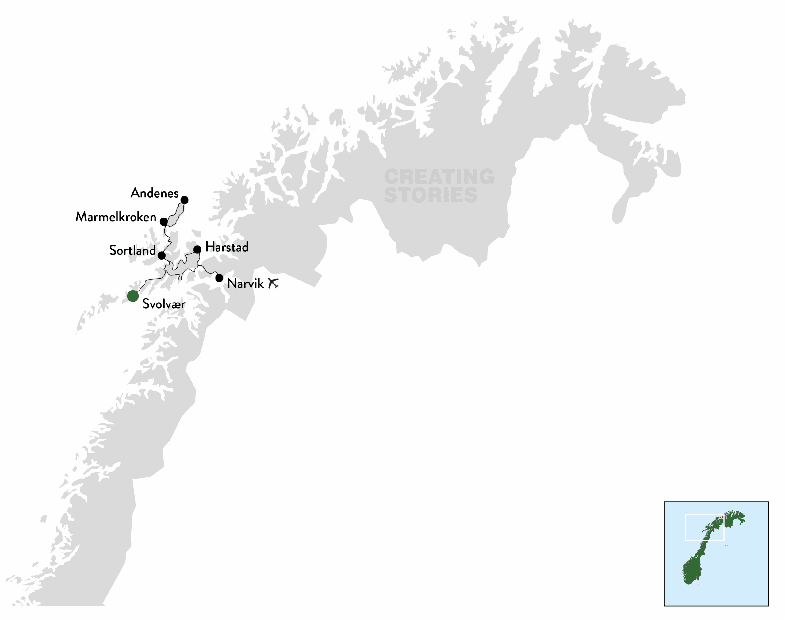 Je reis begint in Svolvær, de hoofdstad van de Lofoten. Hier vaar je de Trollfjord in en ervaar je de steile fjorden van dichtbij. Daarna reis je via Sortland naar Vesterålen, met onderweg een bezoek aan het Hurtigruten Museum in Stokmarknes.