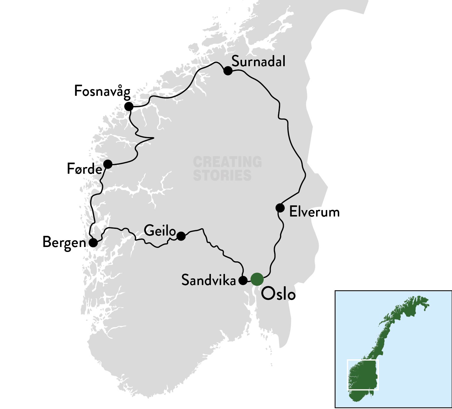 Deze reis omvat de hoofdregio rond Oslo en verbindt deze met de belangrijkste toeristische bestemmingen in Noorwegen, zoals de fjorden. Breng een bezoek aan de Hardangerfjord, Sognefjord en Nordfjord. De reis laat je kennis maken met de kleinere plaatsen en de beroemde landschappen: van bergen tot de fjorden. Er is ook een mogelijkheid om de steden Oslo, Bergen, Ålesund en Trondheim te ontdekken. De reis is speciaal ontworpen voor reizigers die voor het eerst naar Noorwegen reizen.