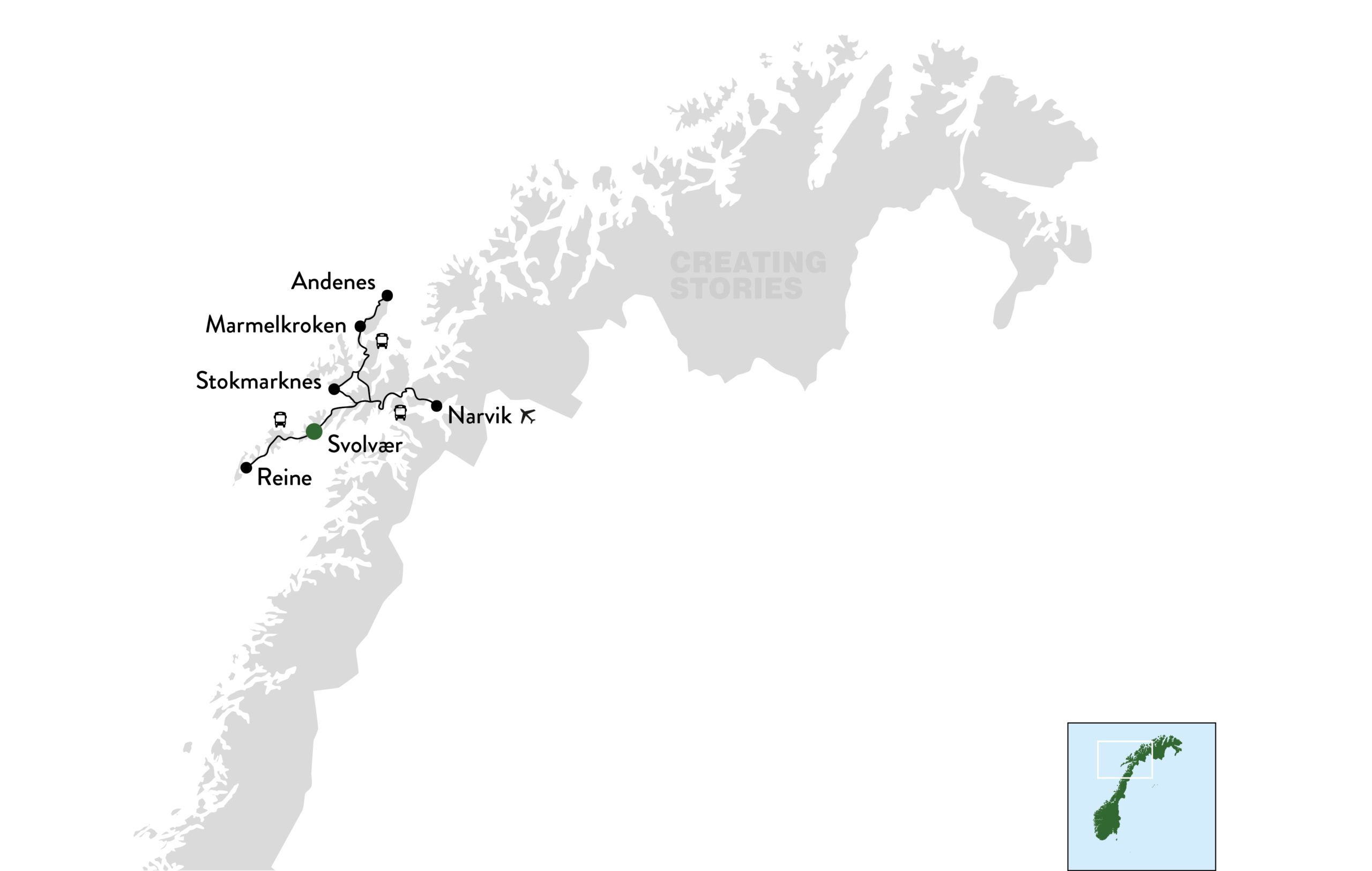 • Internationale vluchten naar luchthaven Evenes (EVE) en v.v. Deze kunnen we uiteraard wel voor je boeken. Vraag ons gerust om advies.