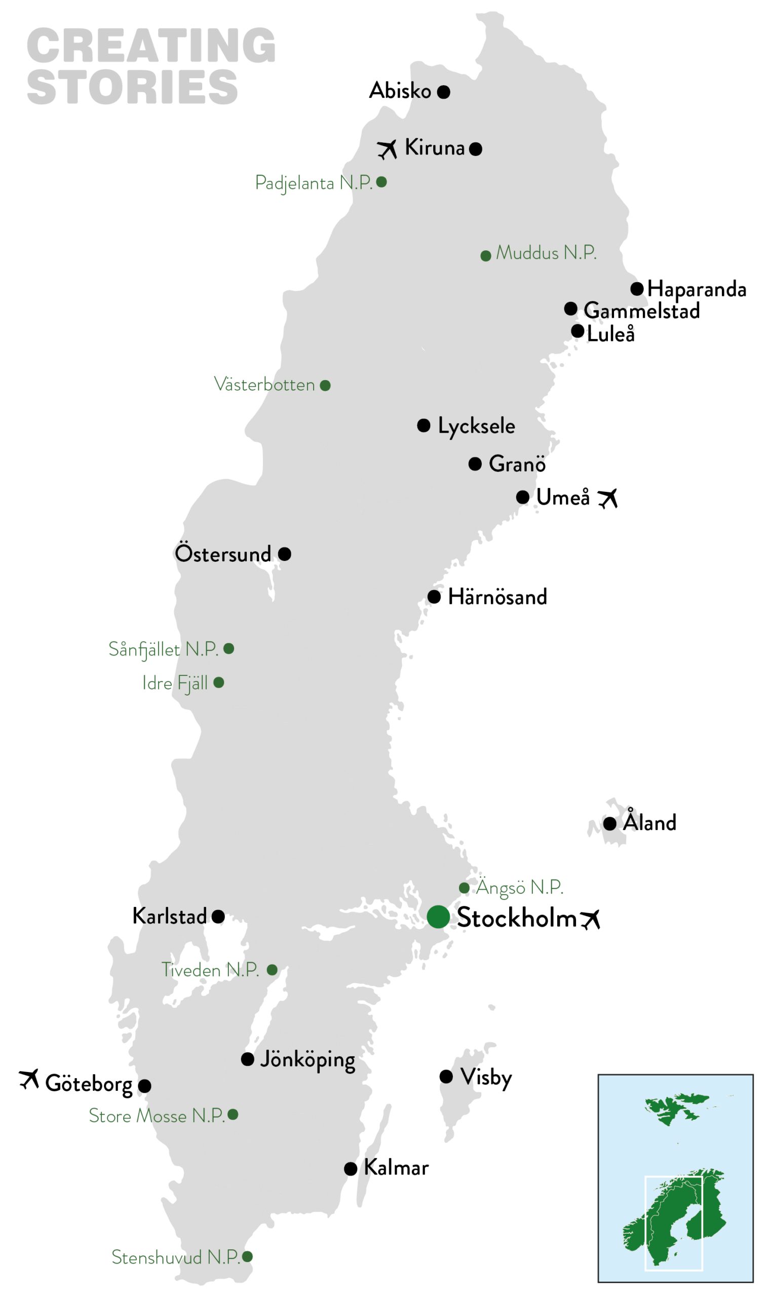 Zweden strekken zich uit van de zuidkust tot het hoge noorden en wordt vaak onderverdeeld in drie regio’s: Zuid-Zweden, Midden-Zweden en Noord-Zweden. Deze brede regio’s bestaan elk uit verschillende provincies met hun eigen landschappen, cultuur en karakter.